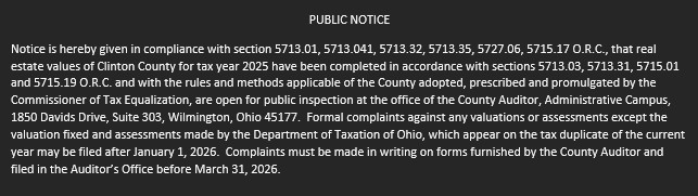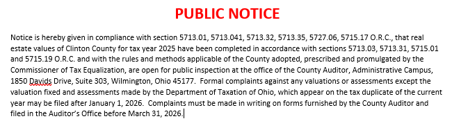 Anyone with questions can contact the auditor’s office by telephone at (937) 382-2250 from 8:00 am – 4:00 pm Monday through Friday or by sending an email to auditor@clintoncountyohio.us.